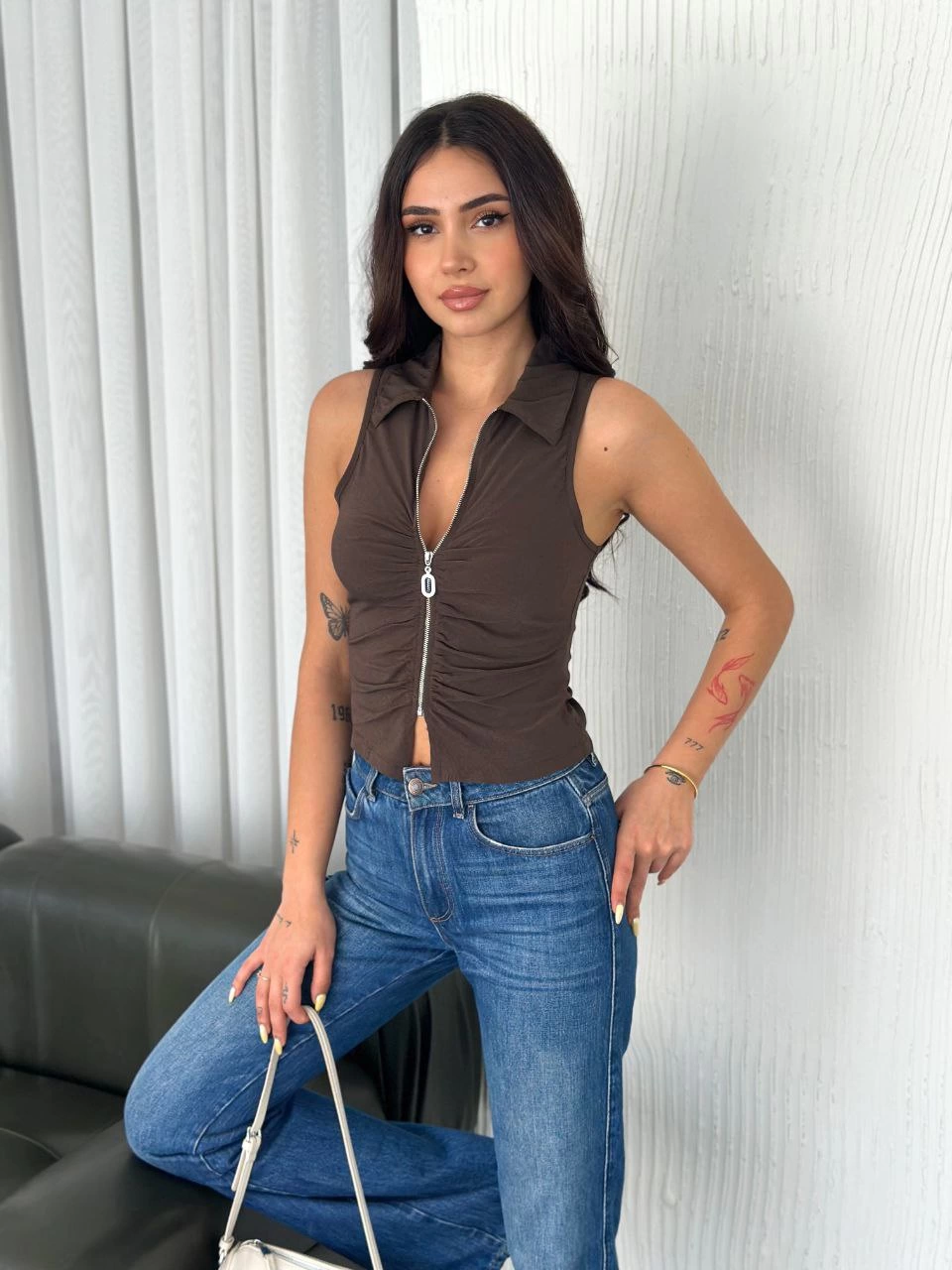 Yakalı Tam Fermuarlı Kolsuz Bluz - Kahverengi